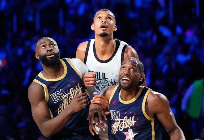 率先开打的是世界队vs新星队,两队打了12分钟后32-32战平,进入加时赛,加时赛中新星队先拿到5分赢下比赛,最终新星队37-35击败世界队。新星队方面:爱德华兹打了9分4秒,9中5(三分7中3)得到13分2板,布克打了10分17秒,5中2(三分3中1)得到5分1板4助。世界队方面:文班打了9分47秒,5中4(三分2中2),4罚4中,得到14分6板3帽,唐斯打了7分54秒,4中3(三分3中2),2罚2中,得到10分1板。