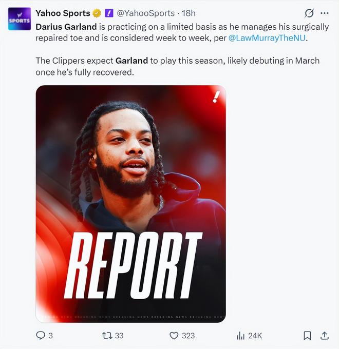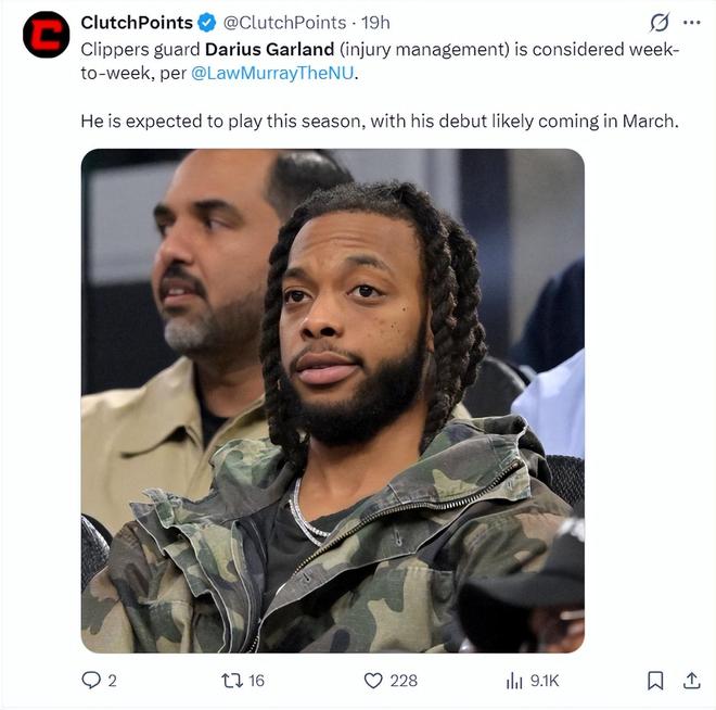 劳里-穆雷还透露快船每一周都要对加兰的伤势进行新的评估,预计他首次身披快船球衣登场会在三月份。