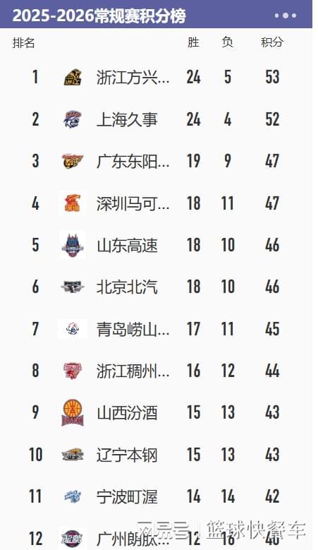 CBA积分榜最新排名出炉!广厦第1辽篮第10:广东第3恐保不住了?