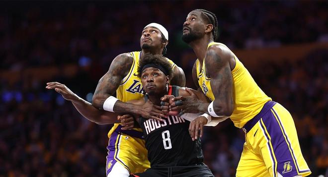 火箭是全联盟篮板球最强的球队,本赛季场均篮板球和场均进攻篮板球都排名联盟第一。相比之下,湖人场均篮板球数排名第27位,场均进攻篮板排名第29位。