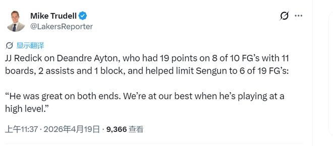 “他在攻防两端都打得很棒,他以高水平打球时,我们就处于最强形态。”在首战击败火箭后,湖人主帅雷迪克这样称赞艾顿。