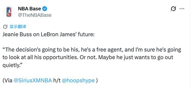 珍妮-巴斯回应道:“我一直都说过,我希望看到他身披湖人战袍退役。但他今夏将成为自由球员,最终选择权完全在他自己手上。即便已经踏入生涯第23个赛季,他依旧是联盟极具价值的球员,他所做到的一切堪称奇迹。不过,决定权终究在他。身为自由球员,他一定会权衡所有选择,当然,也或许不会。说不定他只想低调落幕、悄然退役。”