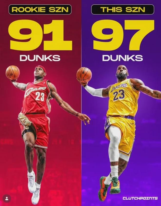 其次,湖人的气势正盛。尽管缺少两大主力,但球队连续取胜给大家带来了十足的信心,他们知道如何去拼得胜利。最后,有詹姆斯在的地方就有一切可能性。在季后赛的舞台上,你可以不服任何人,但必须要服詹姆斯。在过往的比赛中,他已经用表现证明了自己的价值。相信在新的比赛中,詹姆斯会继续贡献惊喜瞬间。对了,不久前美媒ClutchPoints晒出一张图,从图中能看到本赛季为止詹姆斯已经上演了97次扣篮,超过新秀赛季的91次。还能说什么呢?