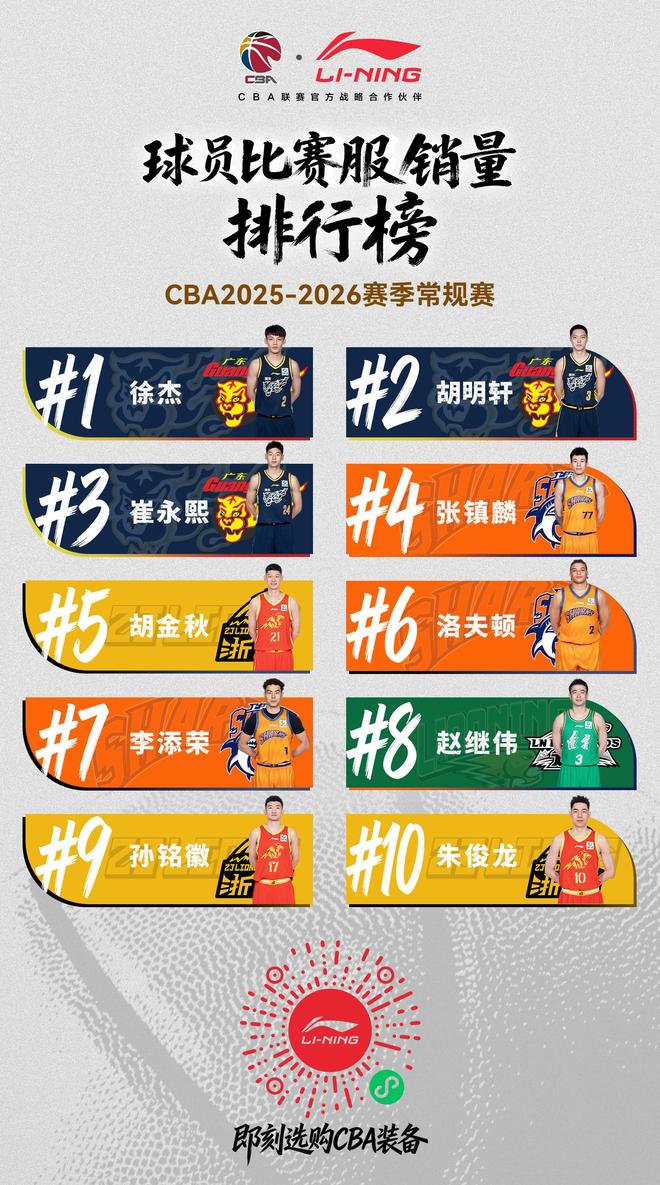 北京时间4月28日,李宁官方公布了本赛季CBA球衣的销售排行。