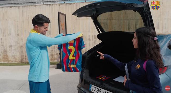 我们给你准备了几个惊喜。我们一起去后备箱。这是我们给你的第一个礼物,是给你女儿们准备的球衣。如果可以的话,你能打开并展示给球迷看看吗?
