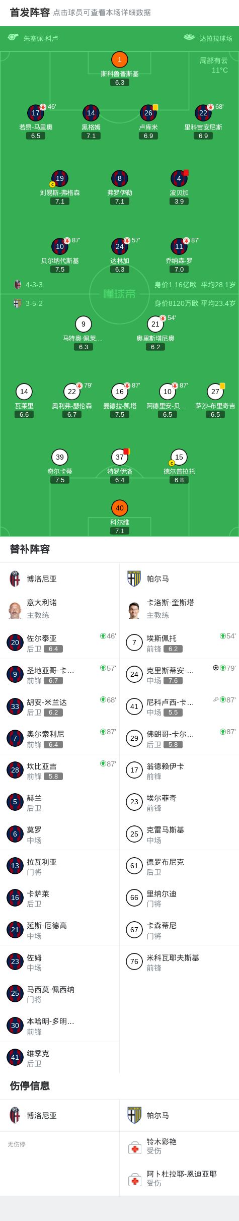 北京时间2月8日意大利足球顶级联赛第24轮,博洛尼亚主场对阵帕尔马。比赛中博洛尼亚一名球员吃到红牌,帕尔马一名球员累计两张黄牌被罚下。下半场补时阶段,帕尔马一名球员助攻克里斯蒂安-奥多涅斯打入全场唯一进球。最终比分博洛尼亚0-1帕尔马。