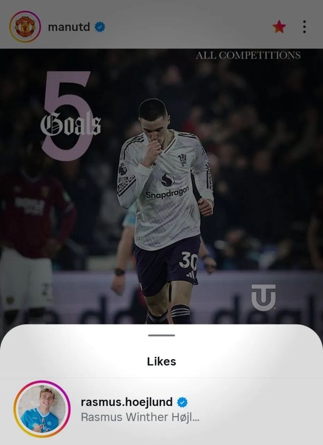 霍伊伦点赞曼联官方发布谢什科近期各项赛事打入5球的帖子[心][心]