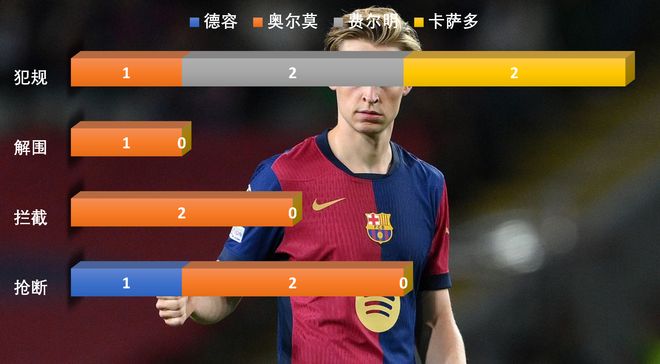 从防守数据上也可以看到,巴萨的4名先发中场(奥尔莫是先发左边锋,上半场后段改打德容身侧的另外一个后腰)里,德容仅有1次抢断,拦截解围和犯规都是0,费尔明和卡萨多更是只有2次犯规。
