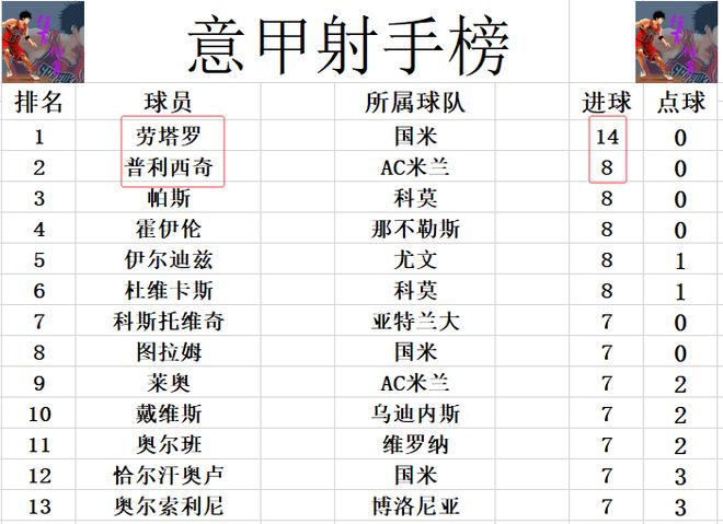 射手榜方面,劳塔罗14球继续领跑,普利西奇今天伤愈复出,只不过替补登场未能进球,还是和帕斯,霍伊伦,伊尔迪兹,杜维卡斯等人8球并列第2。