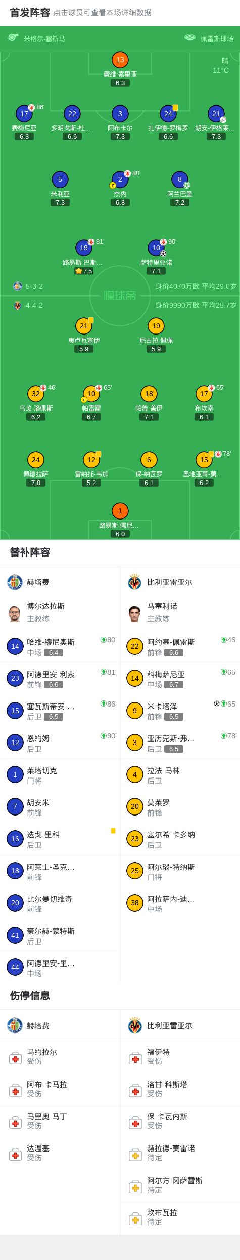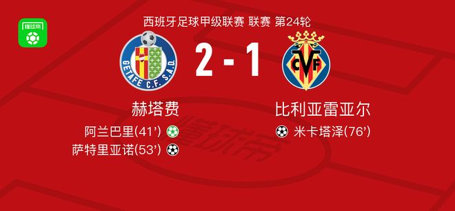 北京时间2月14日西班牙足球甲级联赛 联赛 第24轮,赫塔费主场对阵比利亚雷亚尔。赫塔费阿兰巴里破门,萨特里亚诺破门。比利亚雷亚尔米卡塔泽破门。最终比分赫塔费 2-1 比利亚雷亚尔。