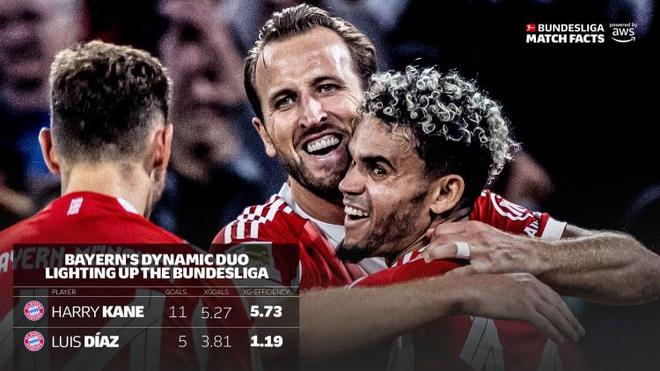能力三:得分。当你时不时吐槽迪亚斯浪费单刀时,你也需要看到迪亚斯的场均射门比利物浦是时期多了整整1/3。更强的射门欲绝不是说明迪亚斯有多“独”,如果拆开看迪亚斯的参与进球和参与制造得分机会完整点位图,你会发现迪亚斯一点都不自私,而且他制造进球的潜力还有很大。而下图是则是德甲第六轮后拜仁两大神锋预期进球和实际进球区分数据,不难发现,迪亚斯的射门权是自己争取而来的,他凭借赛季初远高于预期进球的表现赢得了孔帕尼对其射门的放权。同样,也必须认可迪亚斯的得分能力,比如对阵柏林联合到底起身后的零度角;还有上轮面对曹法尔防守小幅度摆腿内切,推射球门右下角;还有一次次禁区中路内抢点,亦或者横向带球内切……迪亚斯的得分手段之多,令人咂舌。