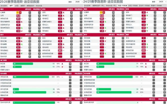 对阵霍芬海姆的比赛只是迪亚斯极致效率淋漓尽致的一次展现:单场5次射门4次射正,10次过人7次成功,传球成功率高达94.7%,而帽子戏法加两造垫也让其单场参与进球数追平拜仁队史边锋纪录。而将时间线拉至整个2025-26赛季,迪亚斯数据升级后的效率会更加明显。