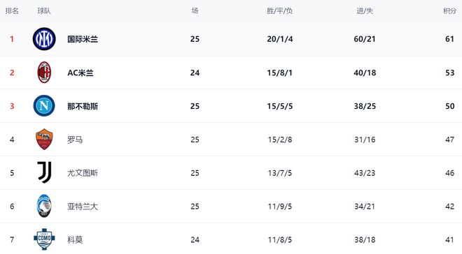 在积分榜上,国际米兰高居榜首,拿到61分,距离冠军越来越近。AC米兰53分排名第2,足足落后8分。不过,AC米兰少踢1轮。那不勒斯战平之后,总积分是50分,排名第3。而罗马则超越了尤文图斯,升到了第4名。罗马总积分是47分,尤文图斯则拿到46分。亚特兰大42分排第6。第7的是科莫,拿到41分。