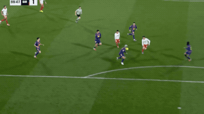 上半场只有1分钟的补时,奥尔莫的速率更快,布林德慢了半拍,直接放倒奥尔莫,裁判判罚点球,布林德双手抱头。