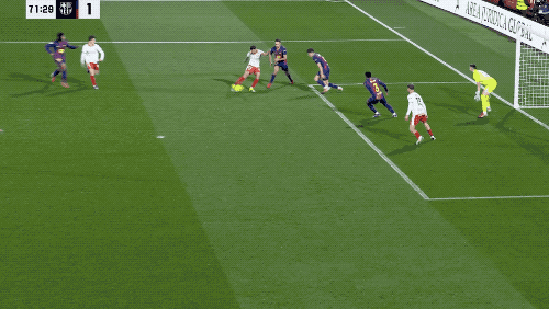 第73分钟,赫罗纳又打进一球,霍安·加西亚在丢球前上演连续极限扑救,赫罗纳越位位置获利,进球被判无效。