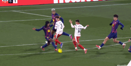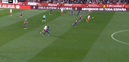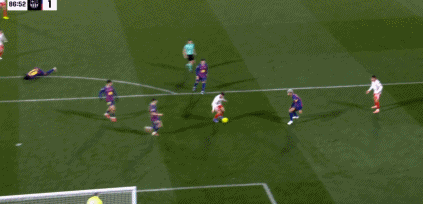 第34分钟,拉菲尼亚直塞,费尔明小角度打门踢飞