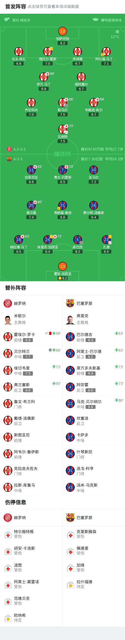 北京时间2月17日西班牙足球甲级联赛 联赛 第24轮,赫罗纳主场对阵巴塞罗那。赫罗纳勒马尔破门,贝尔特兰破门。巴塞罗那库巴西破门。最终比分赫罗纳 2-1 巴萨。