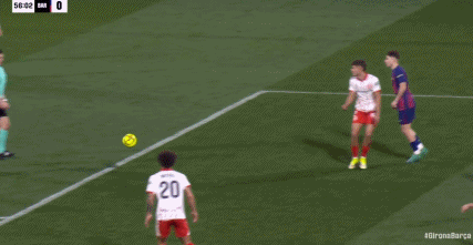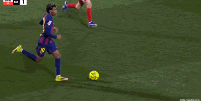 第43分钟,亚马尔斜传,拉菲尼亚打门击中立柱