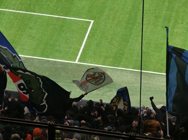 我错过了这个绝杀球,但并没有错过一个精彩的华章:与我一同下楼的四个国米球迷在疯狂庆祝,突然一个从后面扑向我,一边喊着“goal”,一边与我拥抱庆祝。其他几个国米球迷也涌上来。我们至少是从三四级台阶下跌落下来,好在楼梯下面的国米球迷接住了我们,没有人摔倒。更多的人因此搂抱在一起,其中一个球迷还用双手拍了拍我的脸。把我搂抱下台阶的哥们眼镜都差点掉了,而我的脚踝则有一点点轻微扭伤。