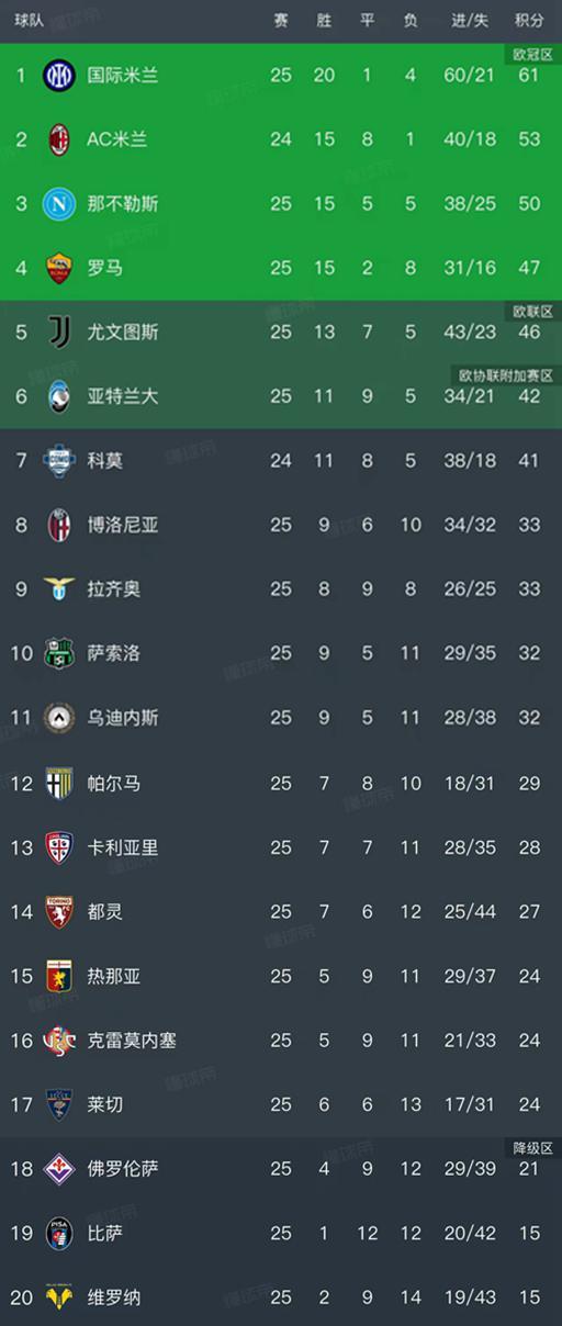 亚特兰大2-0战胜拉齐奥迎来两连胜,以42分暂列第6名。科莫只打了24场比赛,以41分暂列第7名。博洛尼亚、拉齐奥、萨索洛和乌迪内斯的积分都在30分以上,暂列第8-第11名。排在最后三名的球队分别是21分的佛罗伦萨、15分的比萨、维罗纳!