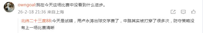 当然也有个别球迷不懂事说丧气话(下图),表示在今天这场比赛中没看到什么进步。对此,有懂球的球迷有理有力有节地跟他摆事实讲道理,认为今天的比赛是种试错而已,不过是用卢永涛出球交学费了。