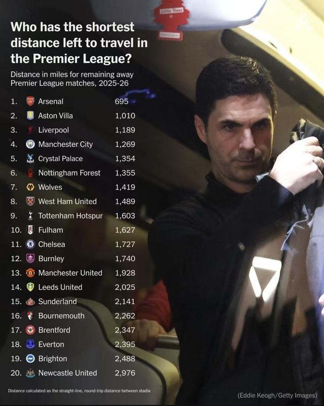 随着赛季关键阶段的临近,冠军之争愈发激烈——各支球队都在想方设法寻找哪怕是微小的优势。据The Athletic统计,阿森纳在剩余的客场比赛中需要行进的距离几乎只有曼城的一半,而且是所有英超球队中距离最短的。