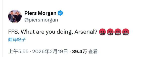 赛后,英国知名媒体人、阿森纳铁杆球迷皮尔斯-摩根在社交媒体上愤怒发声:“够了!你们到底在干什么,阿森纳?”