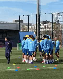 巴萨的训练场上,队友们用传统的“排队拍打”祝贺加维复出。