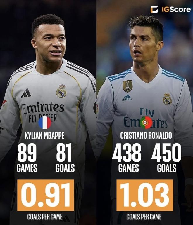 从眼下的趋势看,姆巴佩完全有资格讨论“能不能追上C罗”这个级别的问题;但C罗最可怕的地方,是皇马官网给出的那条线——438场还能做到451球。