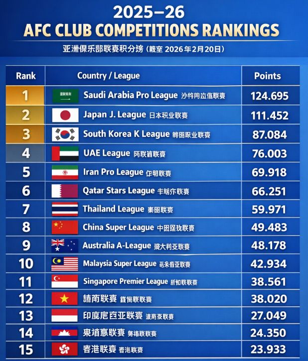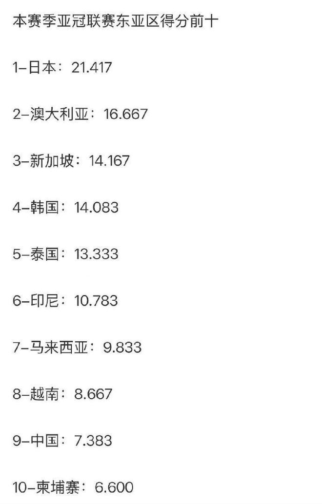 在2025-26赛季,中超球队仅获得7.383分的亚冠技术积分,在东亚区排名第9位,低于泰国(13.333分)、印尼(10.783)、马来西亚(9.833)、越南(8.667)、新加坡(14.167),更是远远低于日本(21.417)、韩国(14.083)。7.383分,让中超排名亚足联第15位,在东亚区则排名第9位,仅比排名第10位的柬埔寨(6.600)多出不到1分。