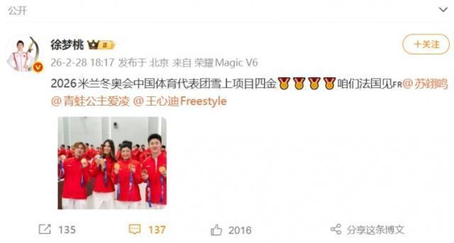 2月28日讯 米兰冬奥会冠军得主徐梦桃更新社媒,晒出了与谷爱凌、苏翊鸣、王心迪的合照。徐梦桃写道: