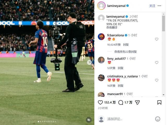上演帽子戏法静待马竞,亚马尔社媒:1%的可能性,99%的信念