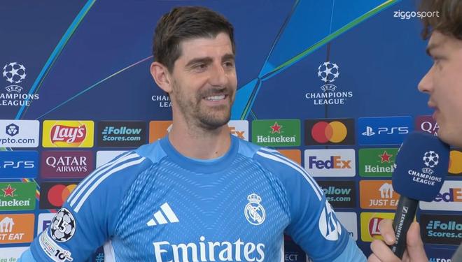 欧冠1/8决赛首回合,皇马3-0战胜曼城,皇马门将库尔图瓦赛后接受了荷兰电视台Ziggo Sport的采访。