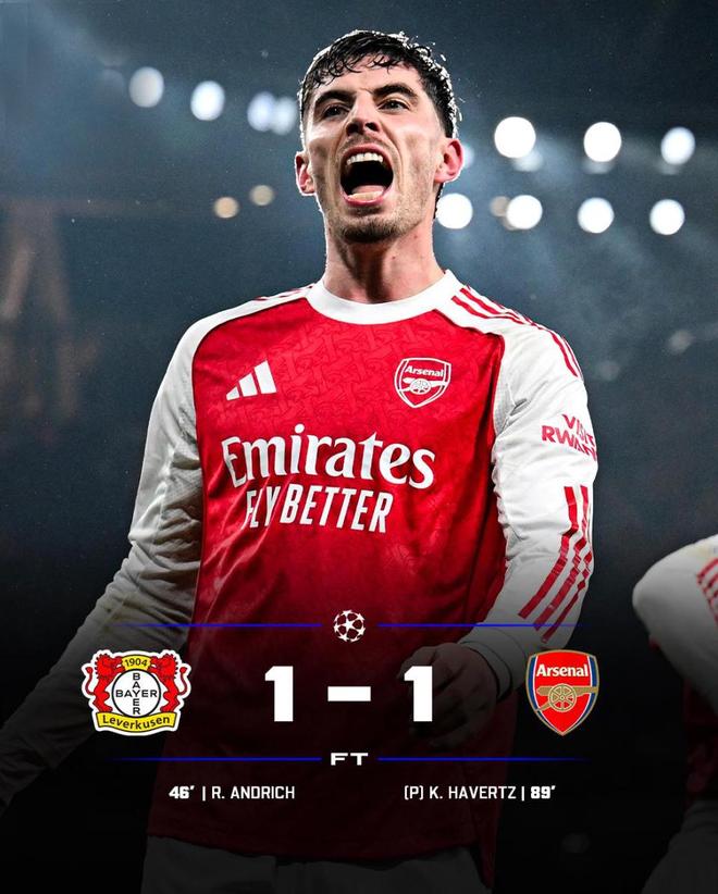 哈弗茨主罚一蹴而就,阿森纳1-1惊险绝平对手,也为次回合加归主场占得先机。