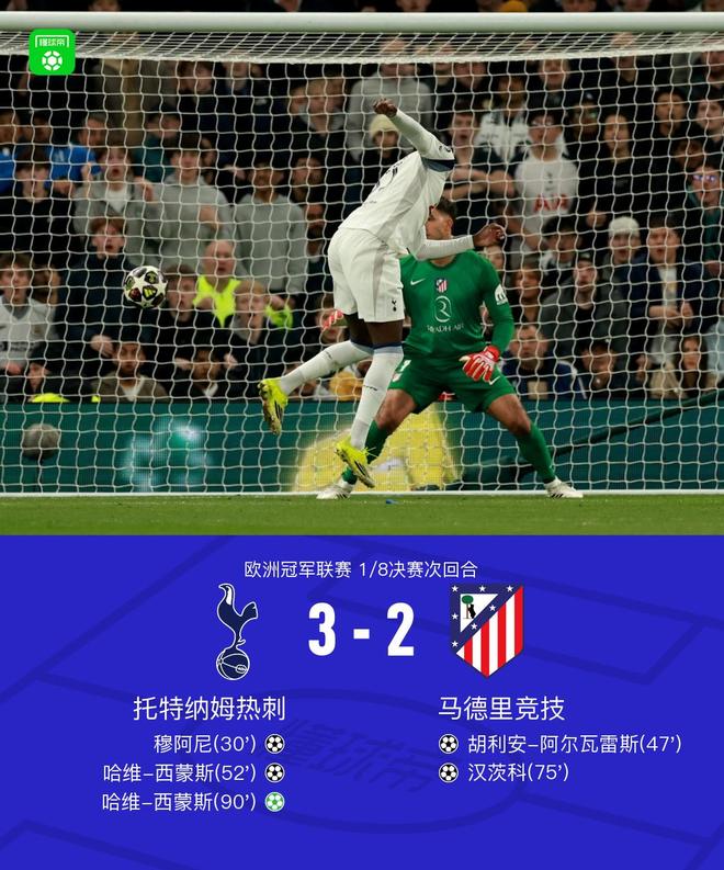 北京时间3月19日欧洲冠军联赛 1/8决赛次回合,托特纳姆热刺对阵马德里竞技。托特纳姆热刺穆阿尼破门,哈维-西蒙斯梅开二度。马德里竞技胡利安-阿尔瓦雷斯破门,汉茨科破门。最终比分热刺 3-2 马竞。两回合总比分热刺5-7马竞。
