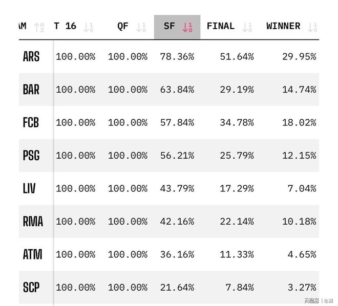 这么看,巴萨和阿森纳极有可能会师半决赛,这也是2006年欧冠决赛的重演。而目前,阿森纳是头号热门,进决赛的几率是51.64%,夺冠的几率是29.95%。