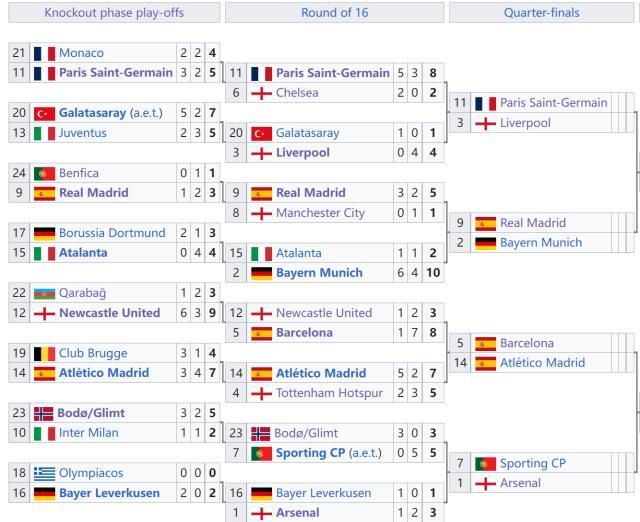 最终,巴黎圣日耳曼、利物浦、皇家马德里、拜仁慕尼黑、巴塞罗那、马德里竞技、里斯本竞技、阿森纳晋级1/4决赛。八强由西甲3队、英超2队、德甲法甲葡超各1队组成。