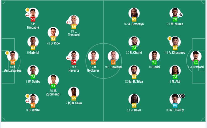 阿森纳首发:13-凯帕、2-萨利巴、4-本·怀特(82’9-热苏斯)、5-因卡皮耶(67’33-卡拉菲奥里)、6-加布里埃尔、36-苏维门迪、41-赖斯、7-萨卡、29-哈弗茨(67’20-马杜埃凯)、19-特罗萨德(82’11-马丁内利)、14-约克雷斯。