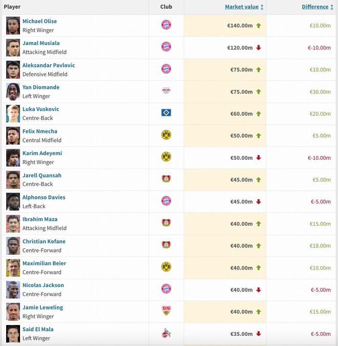 奥利塞以1.4亿欧身价领跑德甲,穆西亚拉1.2亿欧次之,帕夫洛维奇与扬-迪奥曼德以7500万欧的身价并列第三。