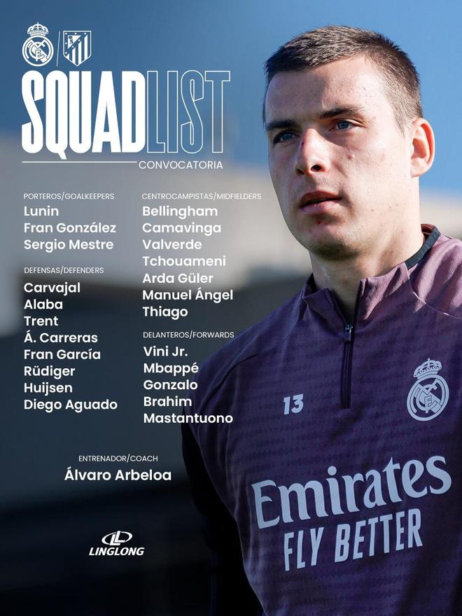 北京时间3月23日凌晨,皇马将在主场对阵马竞,赛前,皇马官方发布了本场比赛名单,贝林厄姆回归,库尔图瓦因伤缺席名单。