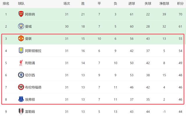 在切尔西身后,布伦特福德和埃弗顿2大黑马,已经对前五席位虎视眈眈。下轮比赛,布伦特福德和埃弗顿就将火拼,谁能击败对手,就将占据先机。布伦特福德最大的问题,是最后7轮比赛,要分别做客曼联、曼城和利物浦,如果这3场比赛能拿分的话,布伦特福德绝对有希望创造奇迹。至于埃弗顿,他们在客场打完布伦特福德之后,就将回到主场迎战利物浦,这2场比赛的结果,很可能决定他们的争五命运。特别是主场和利物浦的比赛,如果能击败对手,埃弗顿很可能一举反超同城死敌。从目前来看,利物浦的和切尔西2大豪门的处境很不乐观,此外维拉也随时可能掉链子,布伦特福德和埃弗顿都有希望后来居上,逆袭杀进前五,晋级下赛季欧冠!