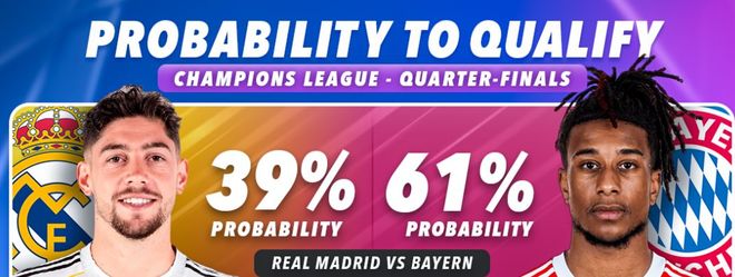 其中,皇马(39%)vs 拜仁(61%)这组对决反倒是拜仁被看好,当然也是八强中最受瞩目的焦点战。尽管首回合皇马3-0大胜曼城晋级,但面对拜仁,他们仅有39%的晋级概率。知名评述员詹俊分析认为:“皇马缺少受伤的库尔图瓦,难度更大了。”