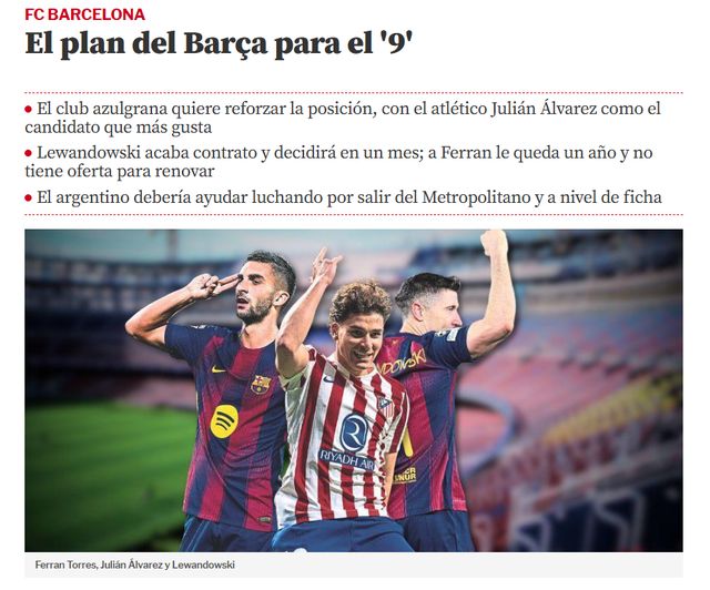 巴萨非常欣赏阿尔瓦雷斯,阿根廷中锋有技术,能回撤串联,具备持球、突破的能力,既能与两翼的亚马尔、拉菲尼亚连线,也可以和佩德里、费尔明合作。《世界体育报》表示,巴萨意识到,球队必须增强9号的实力,“小蜘蛛”是不二人选。