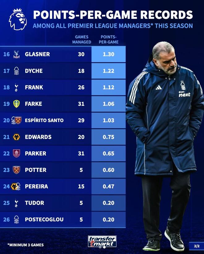 本赛季英超主帅场均积分:卡里克2.3分第1,图多尔、澳波垫底
