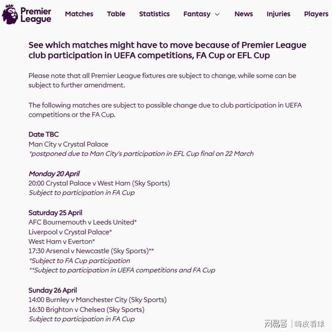 首先是4月20日有1场,水晶宫面对西汉姆的比赛,标注为可能因为足总杯的关系而改期。不过从赛程安排来看,似乎跟足总杯的关系不大,不知哪位球迷朋友,可以解释其中的原因。
