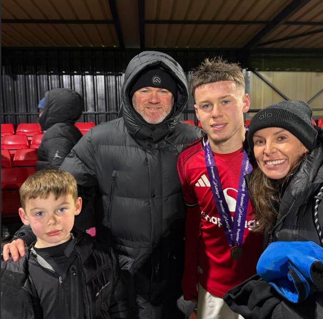 科琳与韦恩-鲁尼自豪地现场见证了儿子凯随曼联夺得U16英超联赛盾杯冠军。凯追随父亲的脚步与曼联签下合同,目前已是U16梯队常规主力,同时还多次被上调至U18梯队出战。
