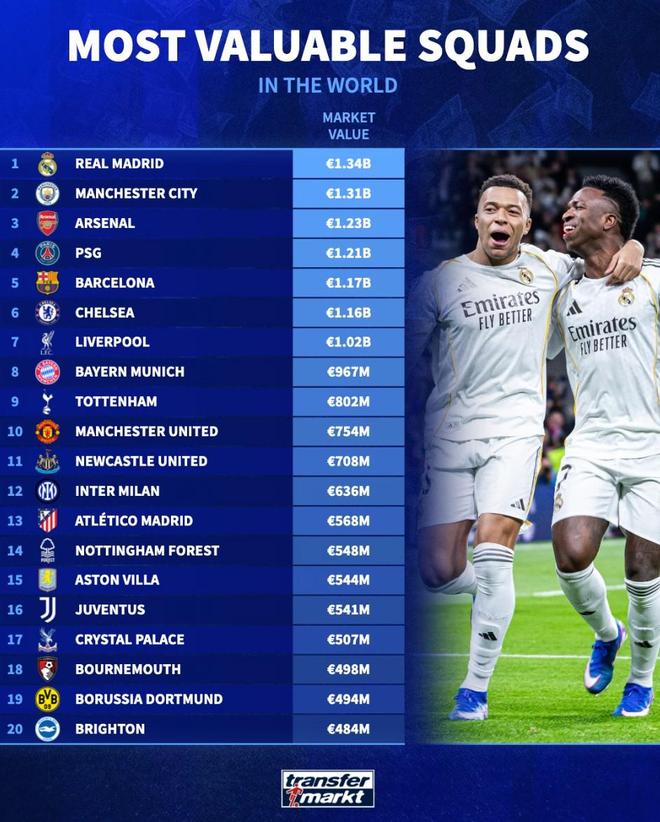 北京时间4月1日,在完成了新一轮的球员身价更新之后,德转列出了目前世界足坛身价排名前20的俱乐部,皇家马德里以13.4亿欧元位居第一,曼城13.1亿欧元第二,阿森纳12.3亿欧元第三。
