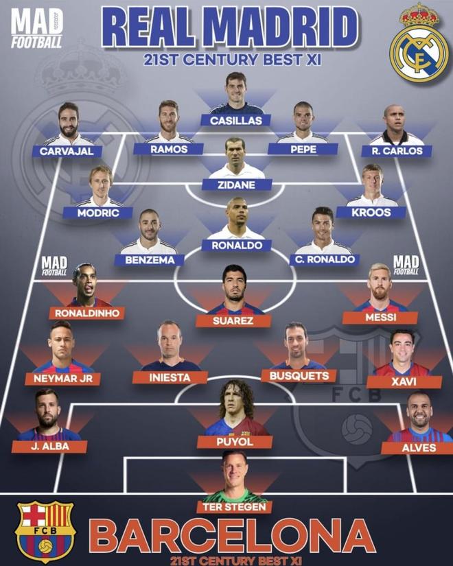 皇马这边的争议点主要有两个:一是左后卫选卡洛斯还是马塞洛,二是中前场的排法有点混,大罗不该出现在中场线里。不过从历史地位、冠军厚度和个人影响力看,皇马这一套大方向是靠谱的。