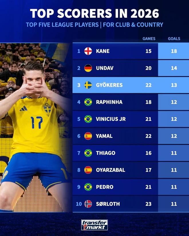 北京时间4月2日,德转统计出了欧洲五大联赛球员2026年国家队+俱乐部赛事的进球榜,哈里-凯恩以15场18球排名第一,在世预赛附加赛决赛中用进球帮助瑞典晋级世界杯的哲凯赖什以13球排名第三。