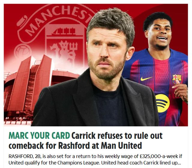 巴萨体育总监德科已经告知拉什福德,俱乐部不可能买断他,即便曼联降价。曼联是如何反应?《太阳报》指出,曼联主帅卡里克答复:“一切尚未尘埃落定,站在我的角度出发,无论谁在球队中,我都希望与他共事,充分发挥他的能力,帮助球队前进。”